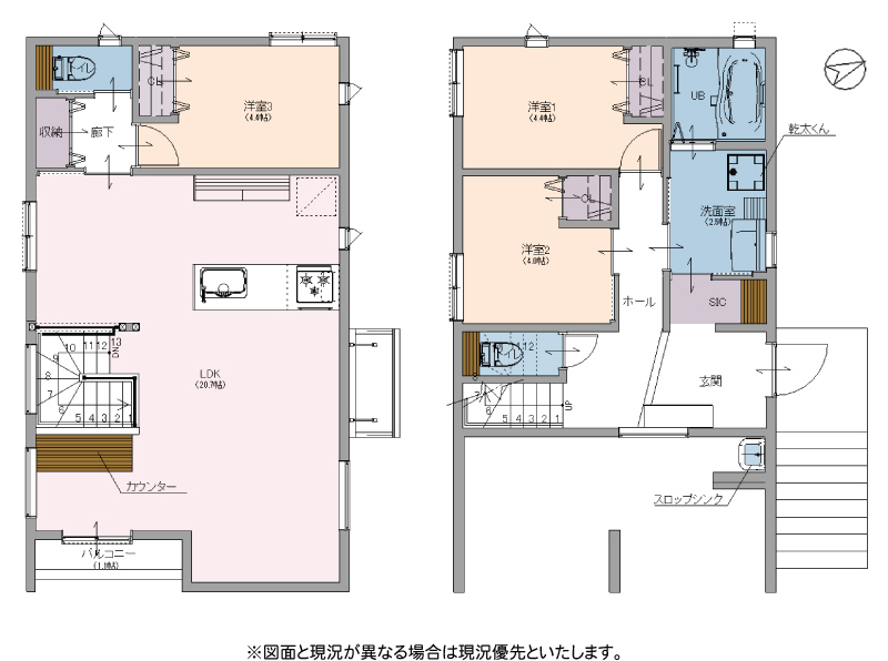 | 間取り詳細 | LDK20.7帖(2階) 洋室4.4帖(1階) 洋室4帖(1階) 洋室4.4帖(2階) |