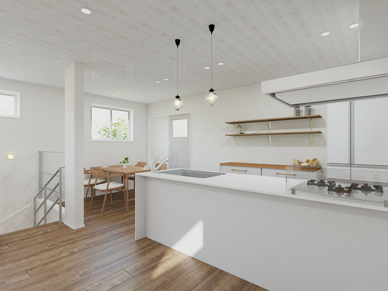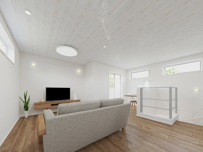 1号棟は「夏の太陽が似合う爽やかなビーチハウス」がコンセプト。天然木材を贅沢に使用した天井や、