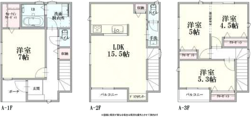 | 間取り詳細 | LDK15.5帖(2階) 洋室7帖(1階) 洋室4.5帖(3階) 洋室5帖(2階) 洋室5.3帖(2階) |