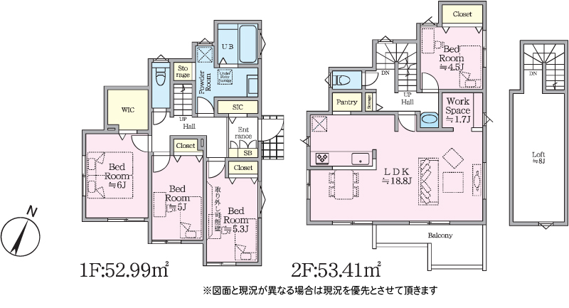 | 間取り詳細 | LDK18.8帖(2階) 洋室5帖(1階) 洋室5.3帖(1階) 洋室6帖(1階) 洋室4.5帖(2階) +ロフト8帖 |