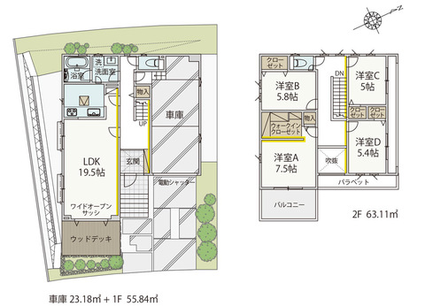 | 間取り詳細 | LDK19.5帖(1階) 洋室7.5帖(2階) 洋室5.8帖(2階) 洋室5.4帖(2階) 洋室5帖(2階) |