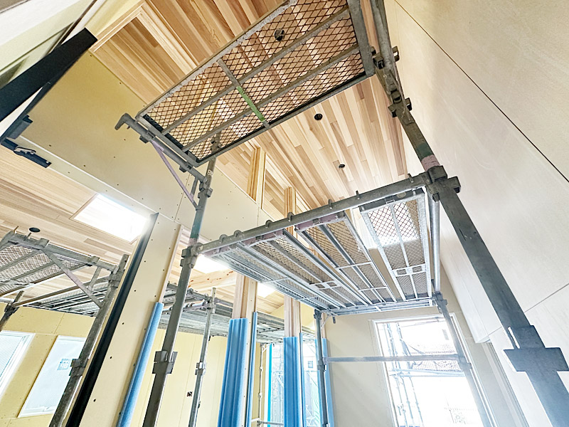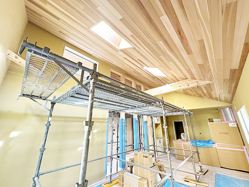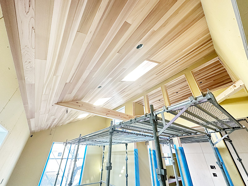 ◇ 杉板貼りの勾配天井が、木の温もりと落ち着きを演出。