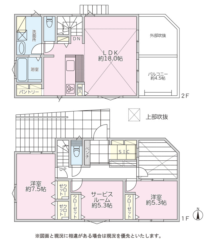 | 間取り詳細 | LDK18帖(2階) 洋室7.5帖(1階) 洋室5.3帖(1階) S5.3帖 (1階) |