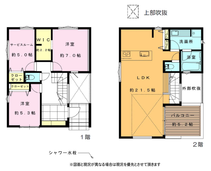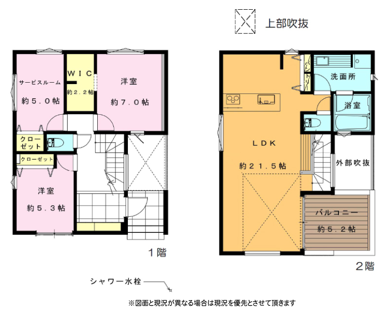 | 間取り詳細 | LDK21.5帖(2階) 洋室5.3帖(1階) 洋室7帖(1階) S5.3帖 (1階) | ||