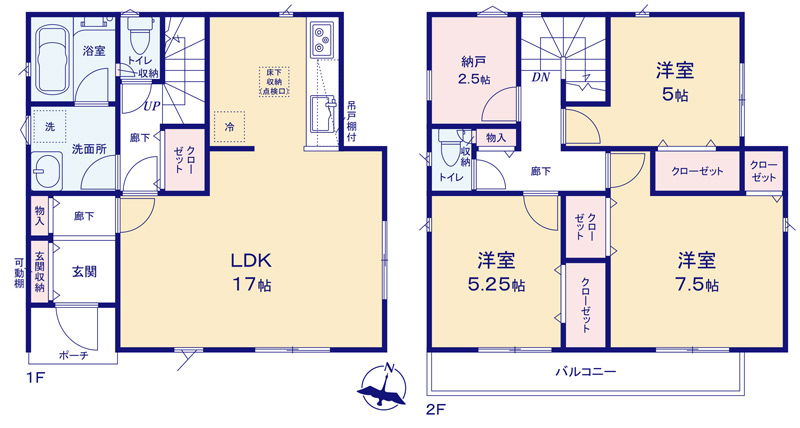 | 間取り詳細 | LDK17.5帖(1階) 洋室7.5帖(2階) 洋室5.25帖(2階) 洋室5帖(2階) S2.5帖 (2階) |