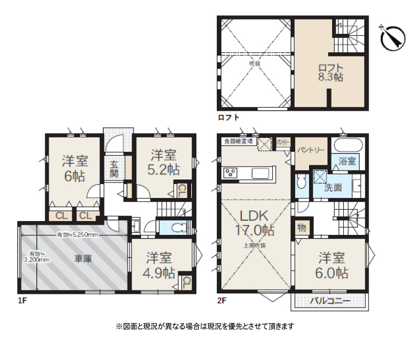 | 間取り詳細 | LDK17帖(2階) 洋室4.9帖(1階) 洋室5.2帖(1階) 洋室6帖(1階) 洋室6帖(2階) |