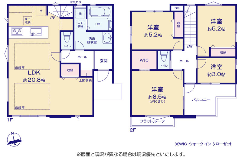 | 間取り詳細 | LDK20.8帖(1階) 洋室8.5帖(2階) 洋室5.2帖×2(2階) 洋室3帖(2階) | ||