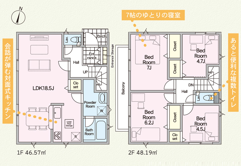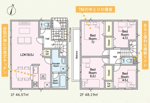 | 間取り詳細 | LDK18.5帖(1階) 洋室7帖(2階) 洋室6.2帖(2階) 洋室4.5帖(2階) 洋室4.7帖(2階) | ||