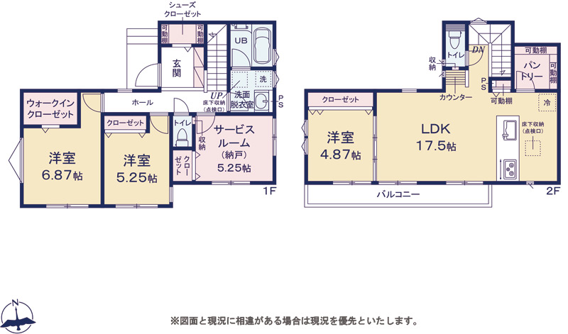 | 間取り詳細 | LDK17.5帖(2階) 洋室4.87帖(2階) 洋室6.87帖(1階) 洋室5.25帖(1階) S5.25帖 (1階) |