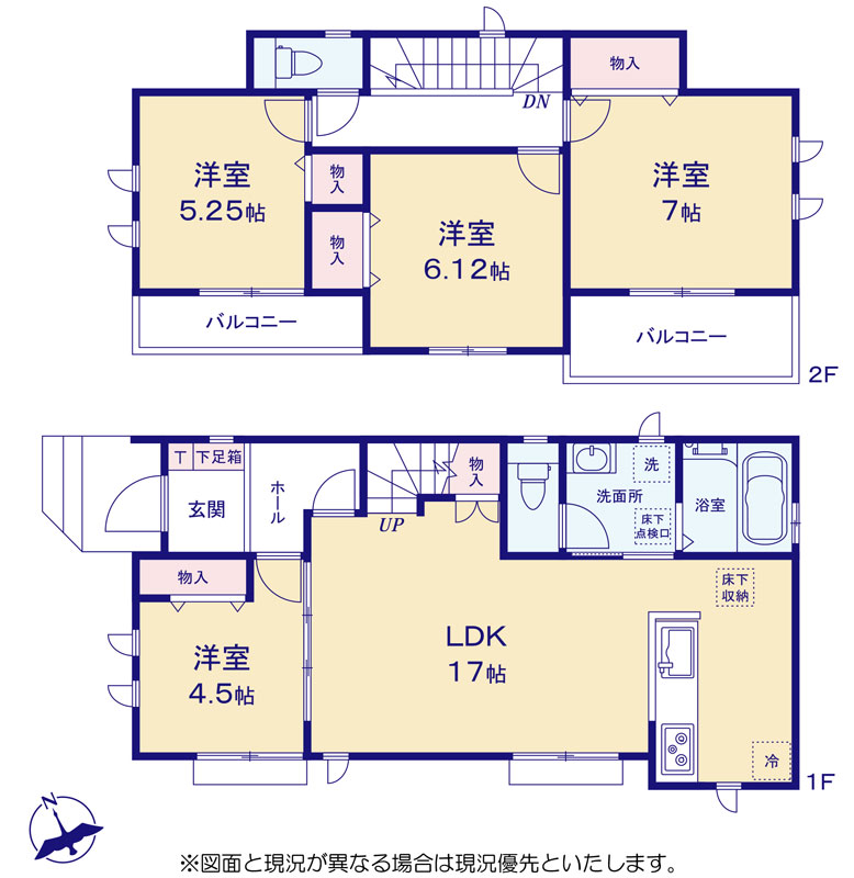 | 間取り詳細 | LDK17帖(1階) 洋室4.5帖(1階) 洋室7帖(2階) 洋室6.12帖(2階) 洋室5.25帖(2階) |