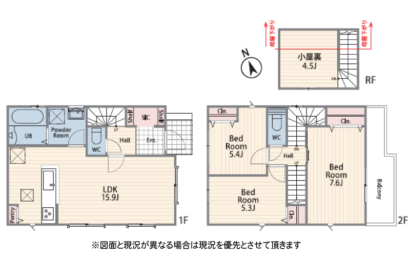 | 間取り詳細 | LDK15.9帖(1階) 洋室5.3帖(2階) 洋室5.4帖(2階) 洋室7.6帖(2階) +小屋裏収納4.5帖 |