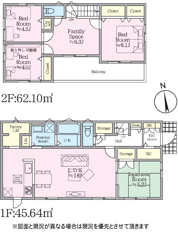| 間取り詳細 | LDK18帖(1階) 和室5.2帖(1階) 洋室4.5帖×2(2階) 洋室6.1帖(2階) +ファミリースペース6.3帖 |