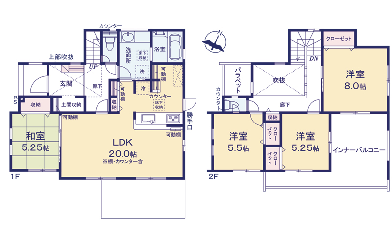 | 間取り詳細 | LDK20帖(1階) 和室5.25帖(1階) 洋室8帖(2階) 洋室5.25帖(2階) |