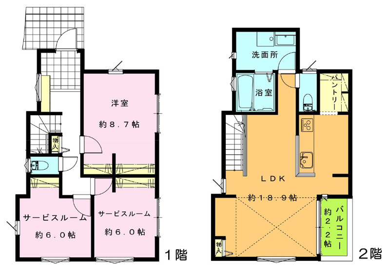 | 間取り詳細 | LDK18.9帖(2階) 洋室8.7帖(1階) 洋室6帖×2(1階) |