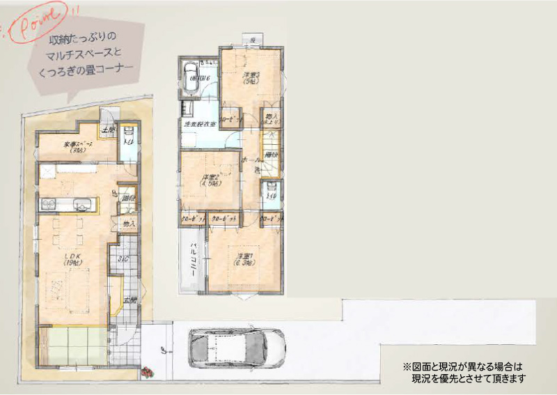 | 間取り詳細 | LDK19帖(1階) 洋室4.5帖(2階) 洋室5帖×2(2階) 洋室6.3帖(2階) +マルチスペース3帖 |