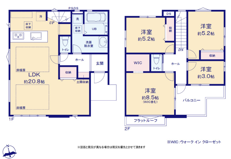 | 間取り詳細 | LDK20.8帖(1階) 洋室8.5帖(2階) 洋室5.2帖×2(2階) 洋室3帖(2階) | ||