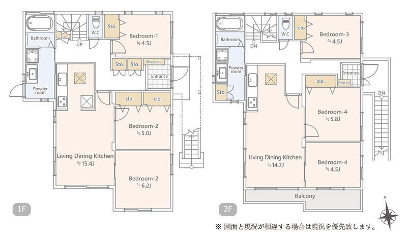 | 間取り詳細 | LDK15.4帖(1階) LDK14.7帖(2階) 洋室6.2帖(1階) 洋室5帖(1階) 洋室4.5帖(1階) 洋室5.8帖(2階) 洋室4.5帖×2(2階) |