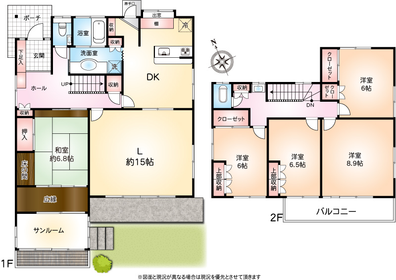 | 間取り詳細 | L15帖(1階) DK(1階) 和室6.8帖(1階) 洋室8.9帖(2階) 洋室6.5帖(2階) 洋室6帖×2(2階) | ||