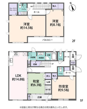 | 間取り詳細 | LDK14.8帖(1階) 和室6.3帖(1階) 洋室14.5帖(2階) 洋室6.3帖(2階) |