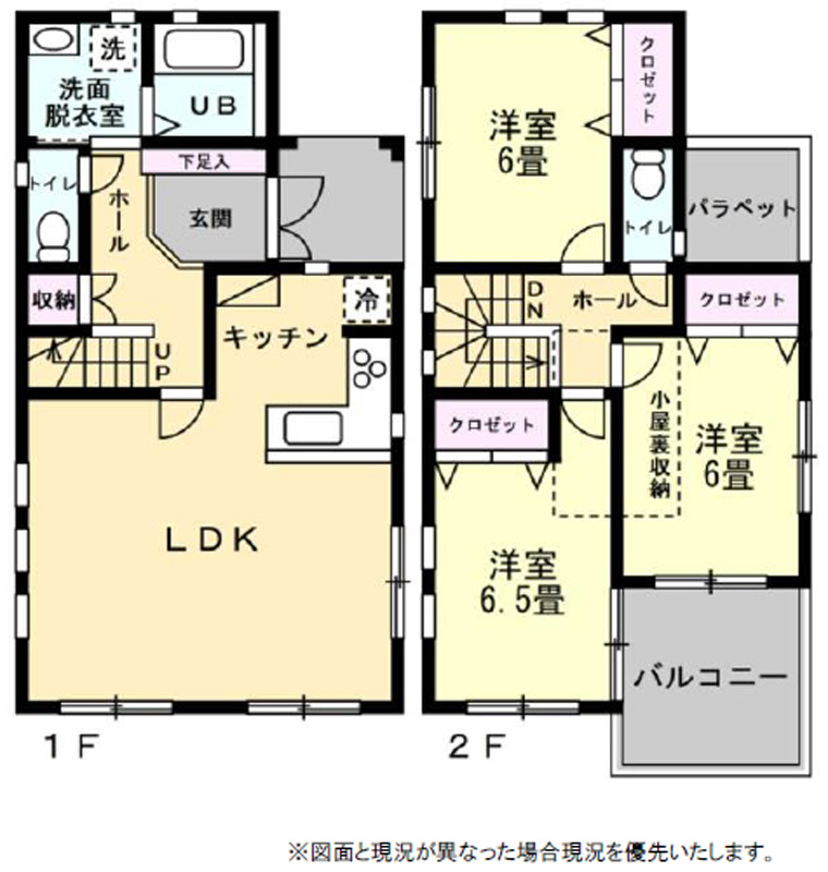 | 間取り詳細 | LDK(1階) 洋室6帖×2(2階) 洋室6.5帖(2階) +小屋裏収納 |