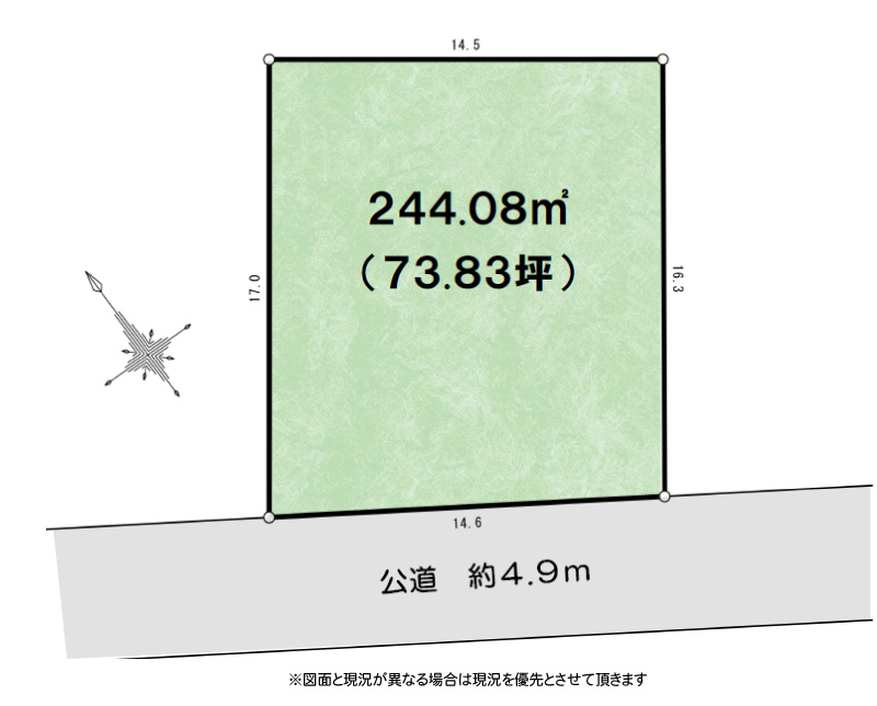 | 備考 | ※登記簿面積:244.00m2(73.81坪)登記簿面積と実測面積に差異が生じていますが地積更正登記は行いません |