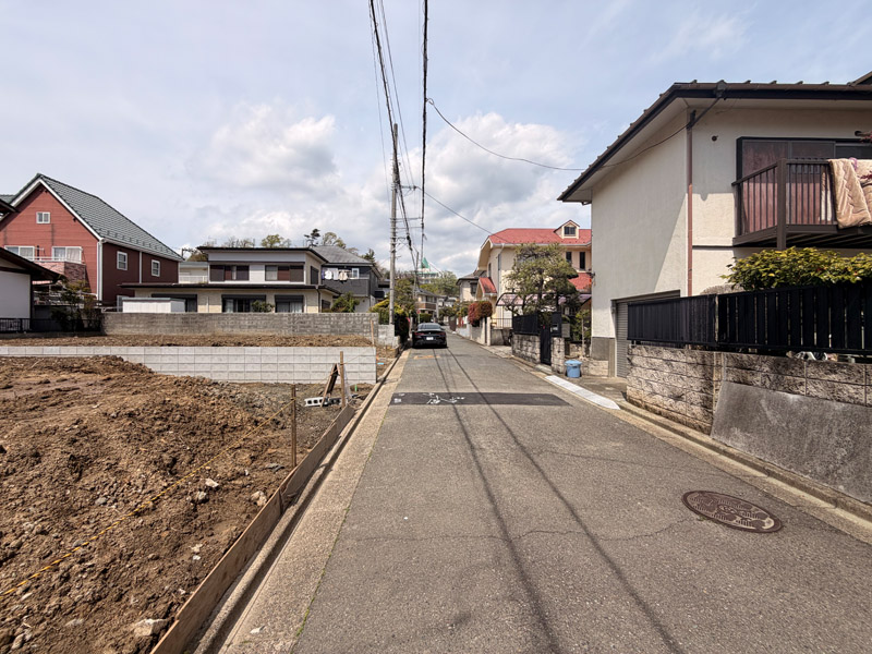 現地の写真からもお分かりいただける通り、前面道路は**幅員約4.9mの「東側公道」**となっています。道路幅がしっかりと確保されているため、大きなお車でも出し入れがしやすく、運転に不慣れな方でも安心です。また、東道路ならではのメリットとして、朝から気持ちの良い陽光がたっぷりと敷地に差し込み、ご家族の健康的な一日のスタートを後押ししてくれます。