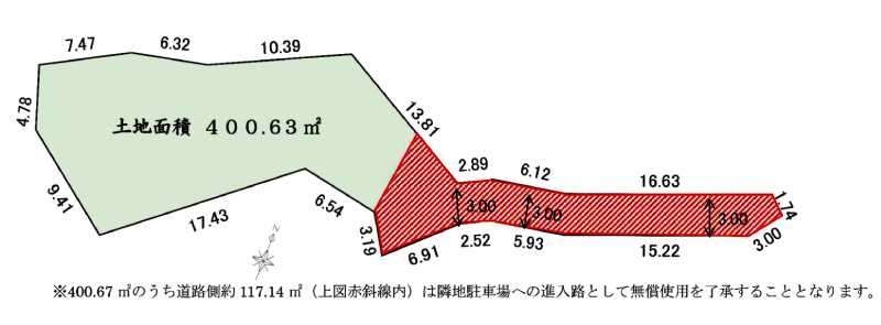 | 備考 | ※地目:雑種地・宅地・山林 ※400.67m2のうち約117.1m2は隣地駐車場への進入路として無償使用を了承する事となります ※不整形地 | ||