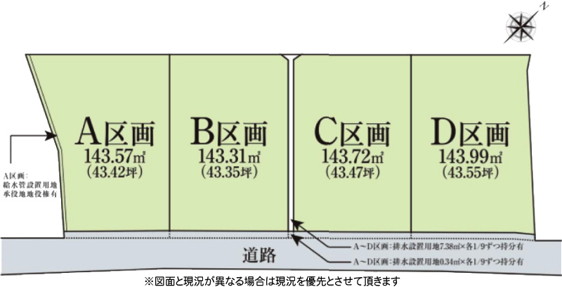 | 備考 | ※A~D区画:給水管用地7.38m2×各1/9ずつ持分有 ※A~D区画排水設置用地0.34m2×各1/9ずつ持分有 ※A区画:敷地の一部に給水管設置用地として地役権有 ※セットバック部分5.93m2別途有 | ||