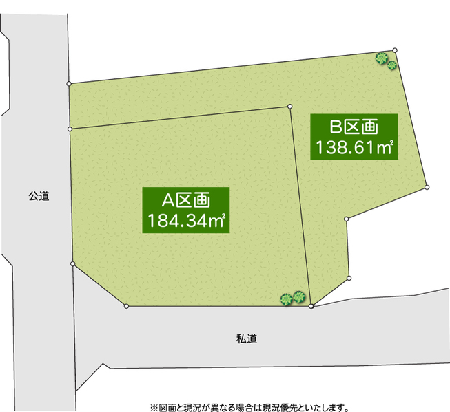 【A区画】土地面積184.34㎡(約55.76坪)!南西角地につき、日当たり・開放感ともに良好な整形地です。 建築条件はございませんので、お好きなハウスメーカー・工務店で理想の住まいを建築可能です。