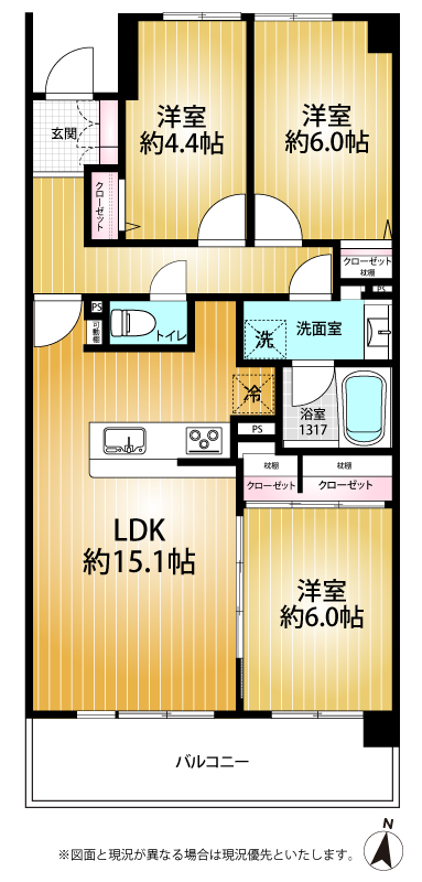 | 間取り詳細 | LDK15.1帖 洋室6帖×2 洋室4.4帖 |