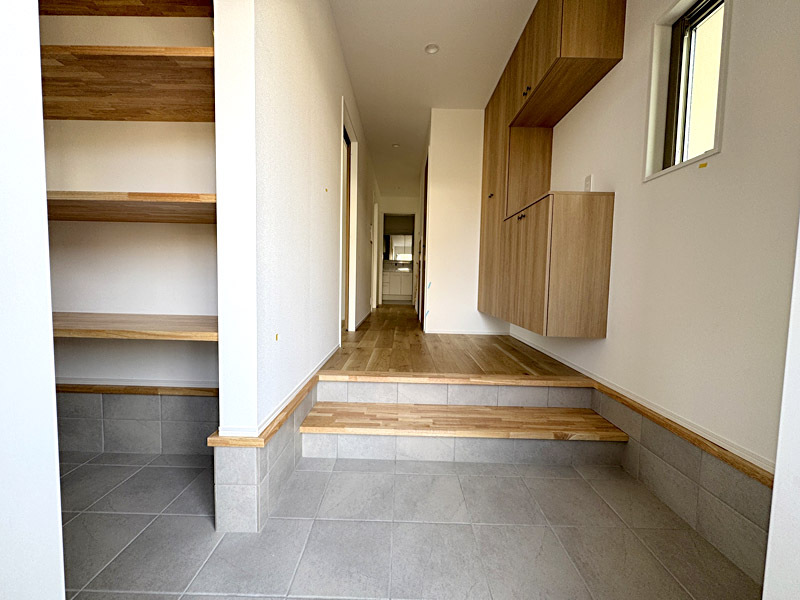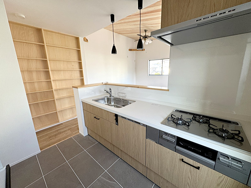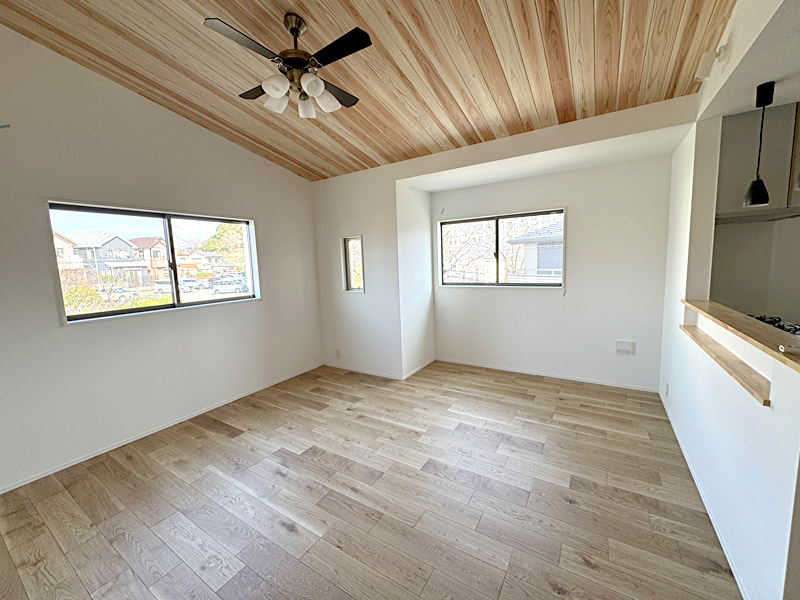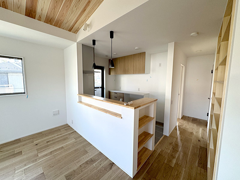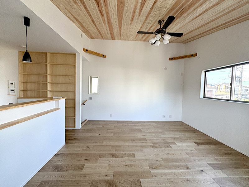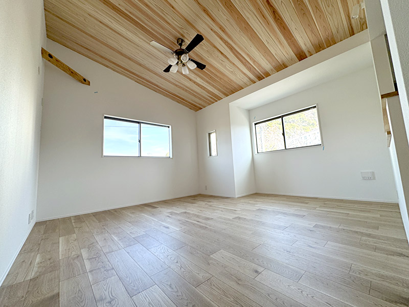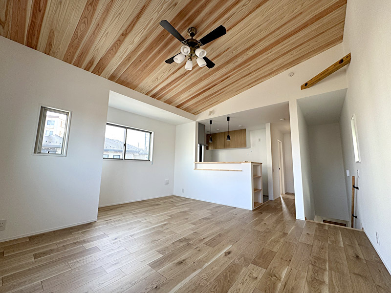 注文住宅を超えたハイグレードな仕様です。建売住宅の概念を打ち破る、住む側に立った建売住宅です。無垢無塗装の床に自然オイル仕上げ。2階にLDK15.84帖、杉板張りの勾配天井!ガス乾燥機「乾太くん」を標準装備。その他建売ではあまり見られない工夫がいっぱいあります。柱は全て国産材、愛媛より檜を直送。断熱材は「スーパージェットファイバー」を使用するなど嬉しい装備がいっぱいです。玄関の土間収納や二段かまち、主寝室のウオークインクローゼットにも注目!