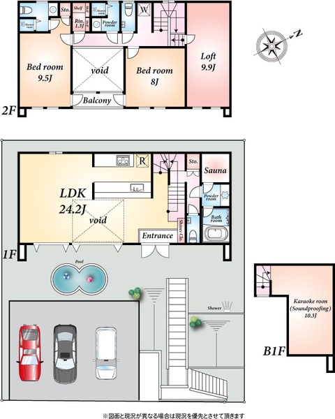 | 間取り詳細 | LDK24.2帖(1階) 洋室8帖(2階) 洋室9.5帖(2階) S10.3帖 (B1階) +ロフト9.9帖 |